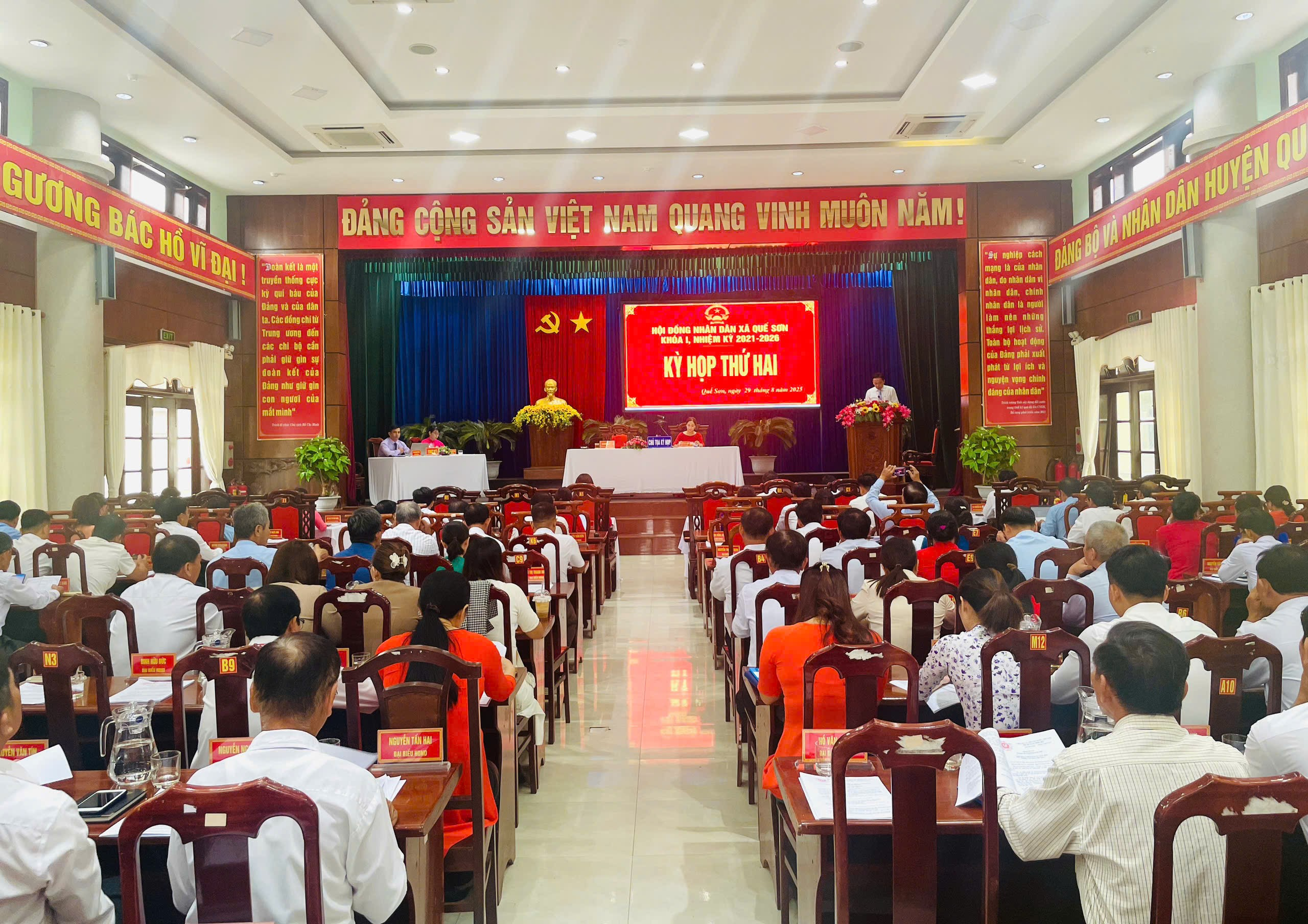 Chiều ngày 29/8/2025, HĐND xã Quế Sơn khóa I, nhiệm kỳ 2021-2026 tổ chức kỳ họp thứ hai, nhằm đánh giá tình hình thực hiện nhiệm vụ phát triển KT-XH, đảm bảo AN-QP 7 tháng đầu năm, triển khai nhiệm vụ trọng tâm 5 tháng cuối năm 2025 và xem xét, quyết định một số nội dung quan trọng khác thuộc thẩm quyền. Các đồng chí: Đinh Nguyên Vũ – Thành ủy viên, Bí thư Đảng ủy, Chủ tịch HĐND xã; Nguyễn Thị Kim Hương – Phó Chủ tịch HĐND xã đồng chủ trì kỳ họp. Tham dự kỳ họp có các đồng chí trong Thường trực Đảng ủy, HĐND, lãnh đạo UBND, Ủy ban MTTQ Việt Nam xã; đại diện lãnh đạo các cơ quan, đơn vị cùng các vị đại biểu HĐND xã.