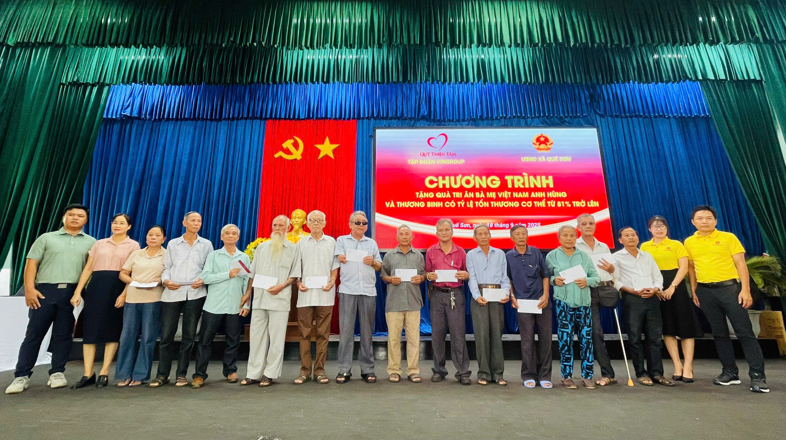 Sáng nay 18/9/2025, UBND xã Quế Sơn phối hợp với Qũy Thiện tâm – Tập đoàn Vingoup tổ chức gặp mặt, tặng quà tri ân các Bà Mẹ Việt Nam anh hùng và thương binh nặng trên địa bàn xã. Dự buổi gặp mặt, về phía đơn vị tài trợ có ông Đặng Loan Anh – đại diện Qũy Thiện tâm - Tập đoàn Vingoup; về phía xã có đại diện lãnh đạo Đảng ủy, HĐND, UBND, Ủy ban MTTQ Việt Nam xã, đại diện lãnh đạo các cơ quan, ngành, đoàn thể liên quan của xã, trưởng các thôn, các Bà mẹ Việt Nam anh hùng, thương binh và thân nhân.